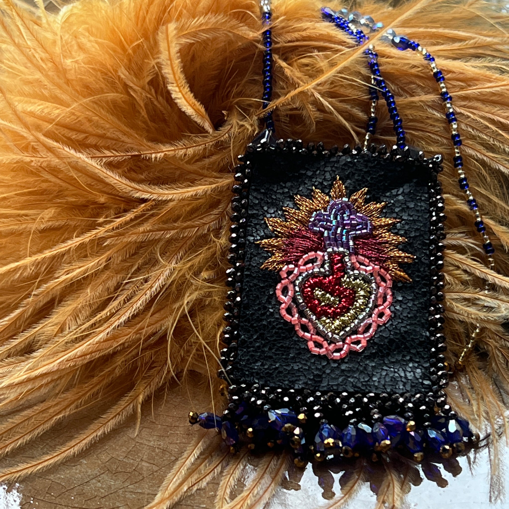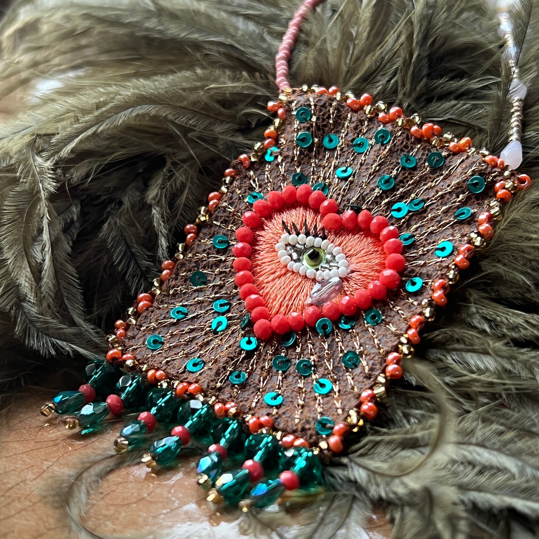 This talisman necklace is hand embroidered on thin leather and has a little pocket where you can put your lucky charm.